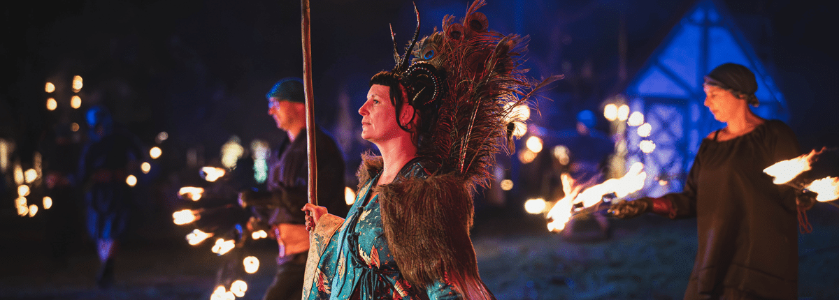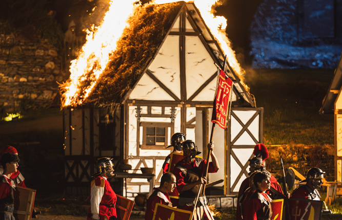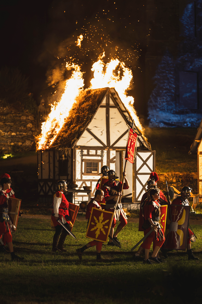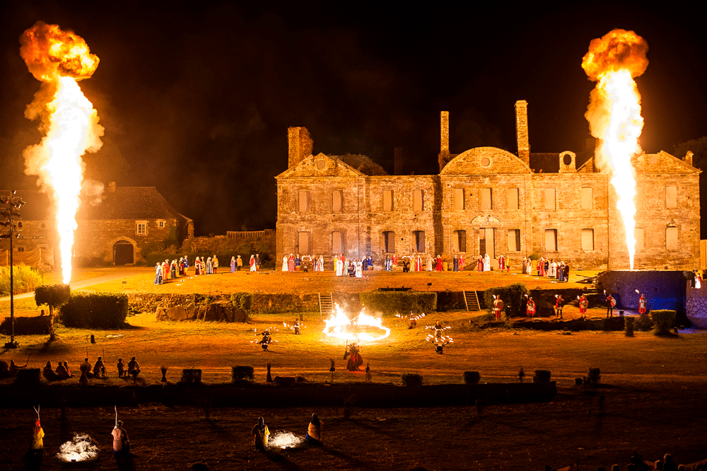 Un spectacle nocturne de 2 heures joué par 350 figurants et 30 cavaliers sur une scène de 8000 m2. Rythmées par une envoûtante bande musicale et des effets pyrotechniques, illustrées par des projections monumentales sur la façade de l’abbaye de Bon-Repos, les scènes vous entraînent dans un spectacle haletant, riche en émotions, où l’inattendu vous attend. Un grand show historique et féérique qui perdure en centre bretagne depuis 35 ans.